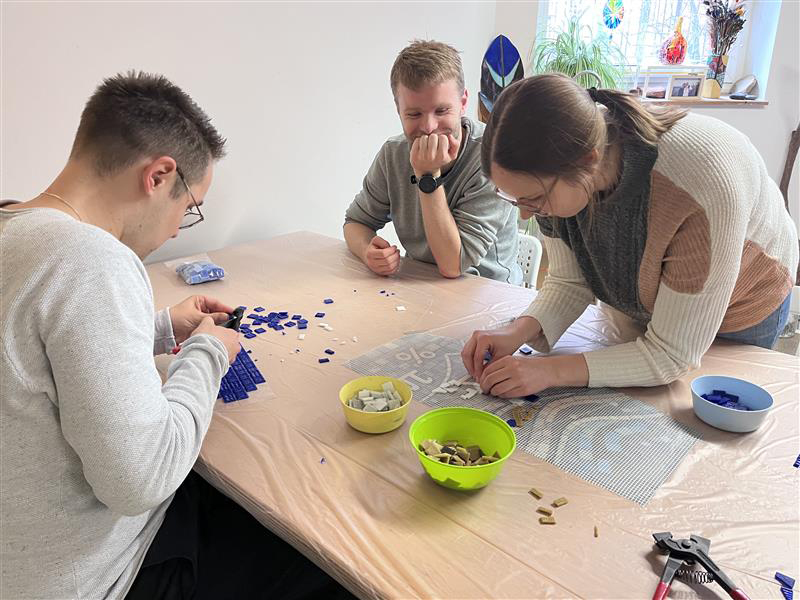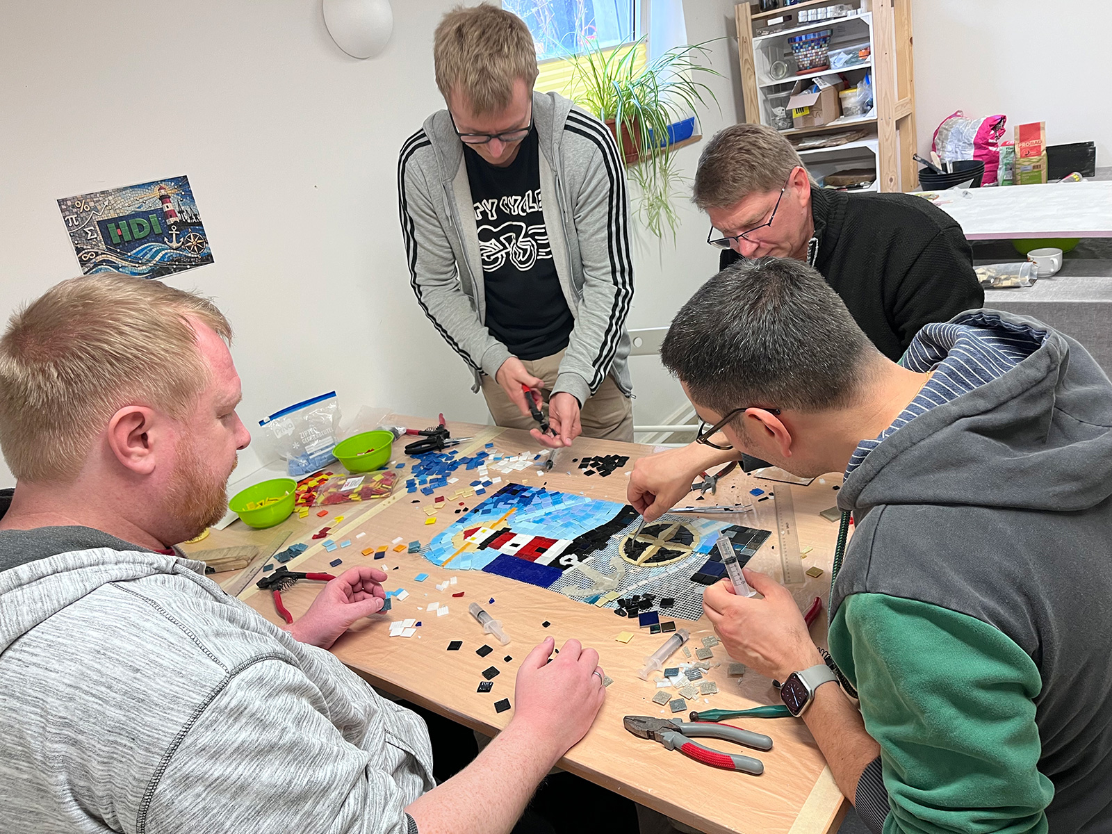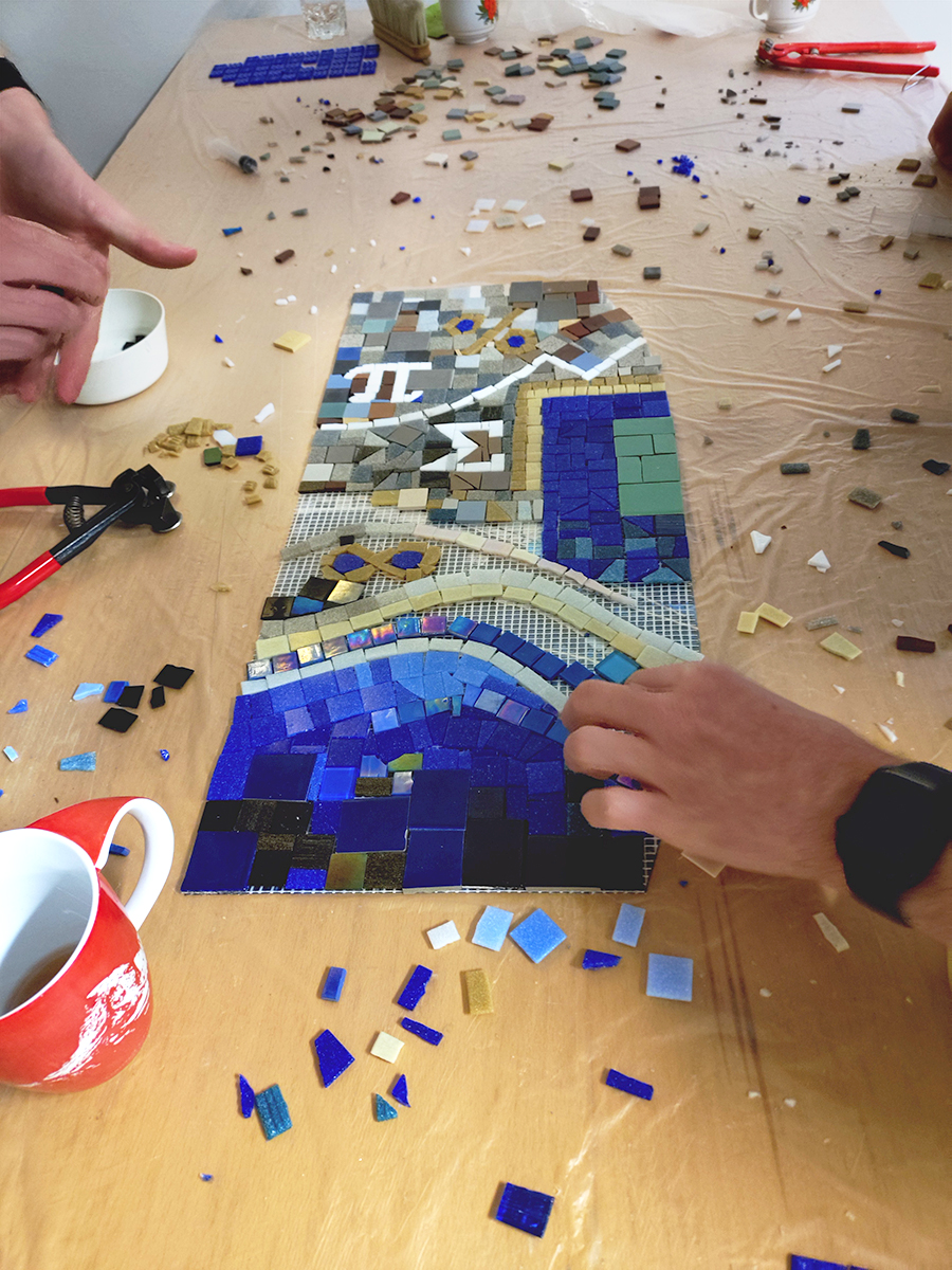 Ein Mosaik für die graue Firmenwand? Das Logo als Kunstwerk oder eine passende Gestaltung für den Flur? Dieses besondere Mosaik-Event bietet mehr: Teambuilding, Hand in Hand arbeiten, planen, umsetzen, gestalten, brechen, hämmern, kleben, verfugen. Es kommen verschiedene Werkzeuge, Materialien und Techniken zum Einsatz. Ich erarbeite mit Ihnen ein passendes Programm, ob vor Ort in Ihrer Firma oder in meiner Werkstatt. Auch als Firmen-Weihnachtsfeier buchbar. Fragen Sie gerne nach: